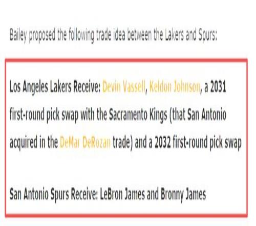 而就在近日,知名美媒Bleacher Report在社交媒體上拋出震撼觀點(diǎn):“詹姆斯和文班亞馬這對(duì)組合能直接統(tǒng)治聯(lián)盟??!”并明確表示馬刺應(yīng)該尋求交易詹姆斯,讓這兩位狀元聯(lián)手。這一大膽設(shè)想迅速引爆NBA圈,而文章中提到4換2潛在交易方案包括:馬刺送出瓦塞爾、凱爾登·約翰遜和兩個(gè)首輪簽互換權(quán),從湖人得到詹姆斯和布朗尼。