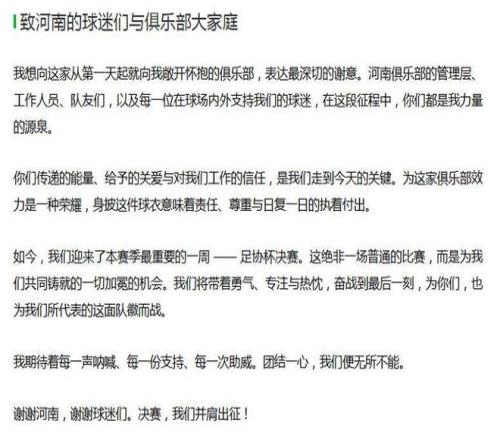 河南非常接近隊(duì)史首冠,將帥非??释?,外援卡多索更新社媒向河南隊(duì)與球迷致謝,并對足協(xié)杯決賽進(jìn)行展望與動員。
