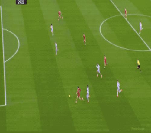 利物浦的攻勢一浪高過一浪,第30分鐘,經(jīng)過連續(xù)一腳傳球,?;倏送蝗黄鹉_兜射遠(yuǎn)角,差之毫厘。