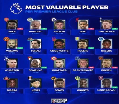 北京時(shí)間12月14日,在更新了英超球員的身價(jià)之后,德轉(zhuǎn)還統(tǒng)計(jì)出了英超20家俱樂(lè)部各自身價(jià)最高的球員,曼城的哈蘭德以2億歐元的身價(jià)領(lǐng)銜,利茲聯(lián)的尼奧托2000萬(wàn)歐元最低。