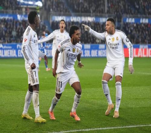 一樣是2:1獲勝,皇馬贏得更為驚險;第24分鐘,貝林厄姆斜塞反擊,姆巴佩左路個人能力內(nèi)切突破兜射率先完成破門,傷缺一場仍然沒有阻擋住姆巴佩進球的步伐,這已經(jīng)是他今年為皇馬打進的第56粒進球了。阿拉維斯頑強地在第69分鐘由比森特單刀完成破門,關(guān)鍵時刻是羅德里戈挺身而出;他在第76分鐘門前包抄接到維尼修斯的左路突破低平球傳中完成破門,皇馬才在客場2:1驚險取勝。連續(xù)2場首發(fā)打進2球,賽季初被棄用的小羅總用2粒進球暫緩了阿隆索的下課危機。