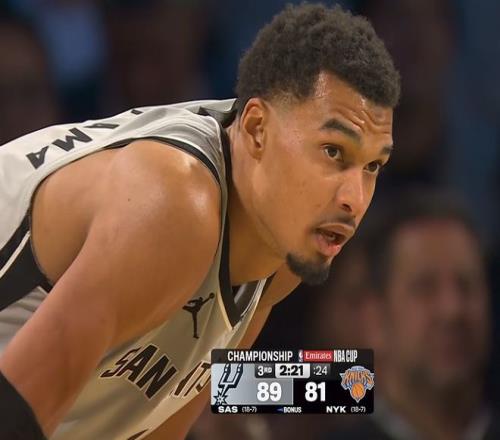 隨著比賽的進(jìn)行,兩隊分差接近,文班亞馬受到傷病以及尼克斯球員的盯防存在感不高。上半場結(jié)束,馬刺61-59尼克斯,文班僅得到4分,反擊背扣沒進(jìn),尼克斯的阿奴諾比拿下20分。